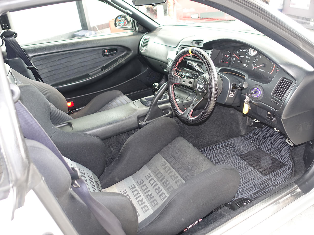 清々しい空気が流れるコクピット、コクピット構成パーツである樹脂部品やプラスチック部品に痛みや割れ、反れも無く美しいコンディションです。またBRIDE製スポーツシートが装備されており4点式シートベルトを用意を用意すれば、直ぐにでもスポーツ走行が可能でございます。